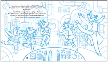 Pour être sûre de l'harmonie de l'ouvrage, je tiens à jour une feuille de références de mon côté avec les éléments récurrents, la palette de couleur, les références de chaque personnage, et les textures. Ce n'est pas un outil que je partage mais il est très important pour moi, notamment lorsque j'illustre un ouvrage complet. Un autre outil que je garde toujours sous la main, c'est le Storyboard. Il ne reste pas à l'étape de composition ou de crayonné mais il est toujours mis à jours au fil du processus. On veut que chaque image coule sur celle d'après et donne envie de tourner la page.