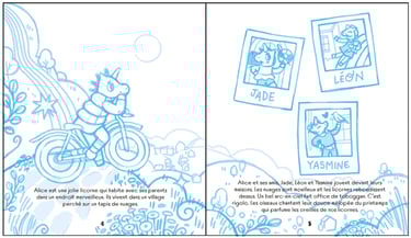 Une fois le contrat signé, j'ai fait l'étape veille et préparation de mon côté. J'ai consulté des livres avec des thématiques similaires, j'ai regardé les différentes manières de représenter des licornes à différents âges, ou comment on représente la pollution, et pris plein de notes. Avec un sujet pas si doux dans un univers fantaisiste, il fallait trouver un équilibre. Ce n'est pas quelque chose que j'ai montré au reste de l'équipe.